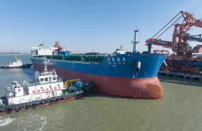 1月2日,一艘船在拖輪協助下停靠黃驊港煤炭碼頭,準備裝運煤炭(無人機照片)。