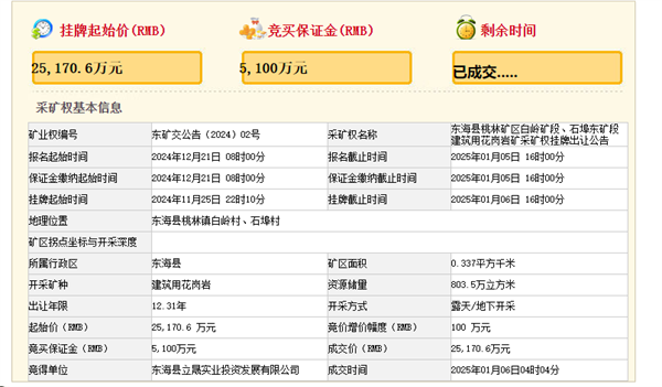 日前,江蘇省連云港市東??h桃林礦區白嶺礦段、石埠東礦段建筑用花崗巖礦采礦權成功出讓。該礦資源儲量2105.2萬噸,擬出讓年限12.31年,起始價超2.51億元。東??h立晟實業投資發展有限公司底價競得,經計算,該項目資源成本約12元/噸。