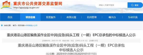 1月9日,重慶市公共資源交易監(jiān)督網(wǎng)公示重慶港巫山港區(qū)鳊魚溪作業(yè)區(qū)中潤(應(yīng)急)碼頭工程(一期)EPC總承包中標候選人。中交路橋華東工程有限公司(聯(lián)合體成員:武漢長江航運規(guī)劃設(shè)計院有限公司、中交路橋建設(shè)有限公司)為第一候選人,投標總報價超2.5億元,總工期730日歷天。