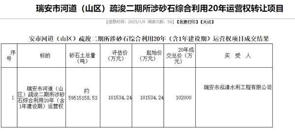 近日,浙江瑞安市公共資源交易中心公開浙江瑞安市河道(山區)疏浚二期所涉砂石綜合利用20年運營權轉讓結果。該項目資源總量約5951.52萬噸,起始價超10.15億元,瑞安市泓清水利工程有限公司10.2億元競得。經計算,該項目噸成本約17.14元。