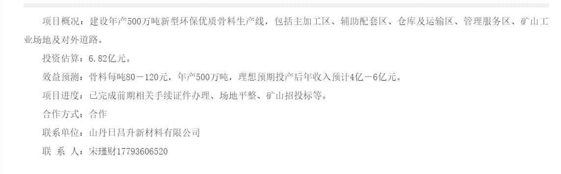 據悉,甘肅張掖日昌升年產500萬噸新型環保優質骨料項目目前已完成前期相關手續證件辦理、場地平整、礦山招投標等。項目投資估算6.82億元,建設年產500萬噸新型環保優質骨料生產線,包括主加工區、輔助配套區、倉庫及運輸區、管理服務區、礦山工業場地及對外道路。效益預測骨料每噸80-120元,年產500萬噸,理想預期投產后年收入預計4億-6億元?,F尋求合作伙伴。 聯系單位:山丹日昌升新材料有限公司 聯系人:宋瑾財17793606520