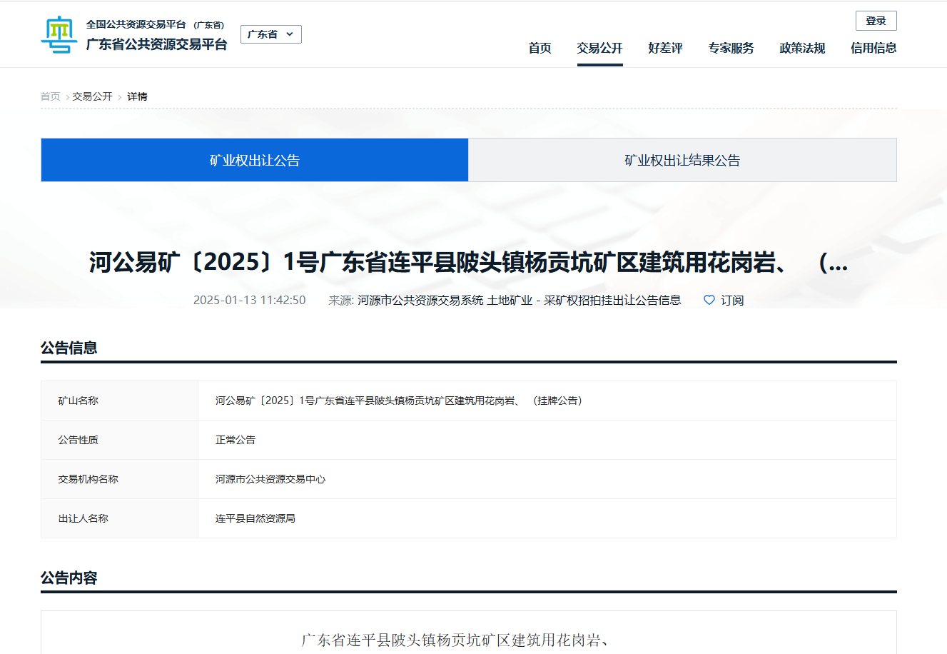 近日,河源市公共資源交易平臺以網上掛牌形式出讓廣東省連平縣陂頭鎮楊貢坑礦區建筑用花崗巖、建筑用輝綠巖礦。礦區范圍內建筑用花崗巖保有控制的資源量619.22萬立方米,開采規模為60萬立方米/年,生產規模為15年,起始價為5713.17萬元。
