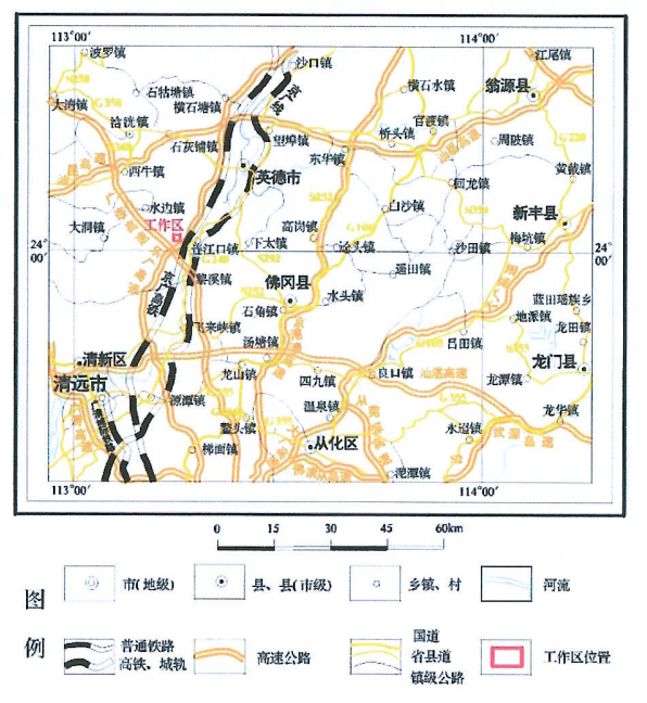 礦區周邊鄉村道路四通八達,有17km鄉道、縣道可連接國道G240,沿國道 G240 約 30km 可達英德市市區,距樂廣高速 G0423 黎溪入口約15km 運距,距廣連高速 S1 黎溪北入口約 20km 運距,距黎溪鎮碼頭直距約3.5km,交通方便。