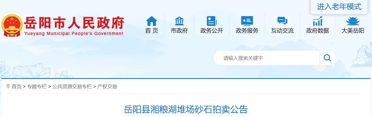近日,湖南省岳陽市人民政府發(fā)布砂石拍賣公告。定于2025年2月14日10時,在岳陽市公共資源交易中心三樓拍賣廳以現(xiàn)場競價的方式對位于岳陽縣湘糧湖堆場砂石進行公開拍賣處置,標的物約86.5萬噸,參考價近4581.17萬元(折算約為53元/噸,含稅13%)。