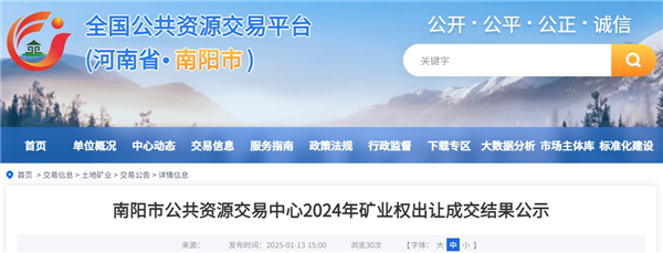 1月10日,河南省南陽市成功出讓3宗采礦權,儲量共約1.05億噸,成交價共近4.45億元。據悉,這3宗礦分別位于鄧州市、桐柏縣、內鄉縣,其中鄧州市杏山蔣家溝礦資源儲量及年產能均較大。