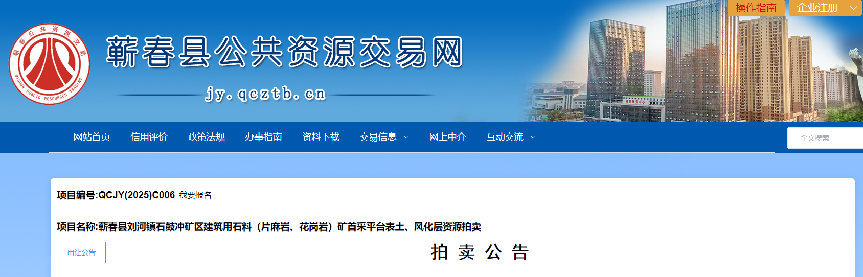 近日,湖北省黃岡市蘄春縣劉河鎮石鼓沖礦區建筑用石料(片麻巖、花崗巖)礦首采平臺表土、風化層資源定于2025年1月20日(星期一)上午10時30分整在蘄春縣公共資源交易中心拍賣。數量約1924.6萬噸,參考價約2502萬元(參考單價約1.3元每噸)。