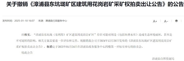 據福建漳州漳浦縣行政服務中心消息,該地掛牌出讓的漳浦縣東坑垅礦區建筑用花崗巖礦采礦權,因存在可能對周邊(包括魚塘水庫)造成生態環境破壞,甚至是不可逆轉的影響,相關方案需要進一步評估和完善,現撤銷拍賣。