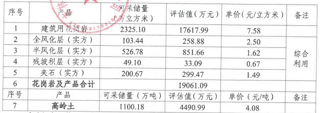 產品銷售價格(不含稅):規格碎石62.83元/方;機制砂價格為60.18元/方;水洗砂價格為60.18元/方;高嶺土價格為57.52元/噸;半風化工程填石料及夾石價格為17.7元/方;殘坡積層生產的填土及尾泥價格為8元/方。