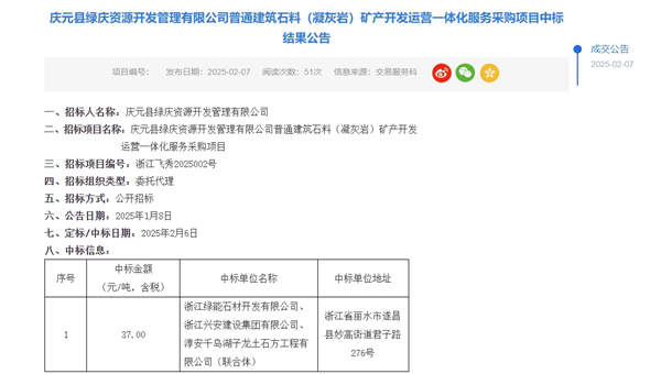 2月7日,浙江省麗水市533萬噸/年砂石礦開發運營一體化服務采購項目公布中標結果。由浙江綠能石材開發有限公司、浙江興安建設集團有限公司、淳安千島湖子龍土石方工程有限公司3家民營企業組成的聯合體成功中標該項目,中標金額為37元/噸,服務期限為5年(8個月內完成礦山前期建設及設備安裝調試實現開機試生產)。