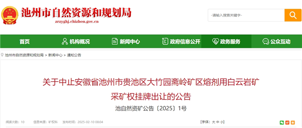 2月10日,安徽省池州市自然資源和規劃局發布公告表示,因受相關因素影響,經市政府同意,決定中止安徽省池州市貴池區大竹園齋嶺礦區熔劑用白云巖礦采礦權掛牌出讓。