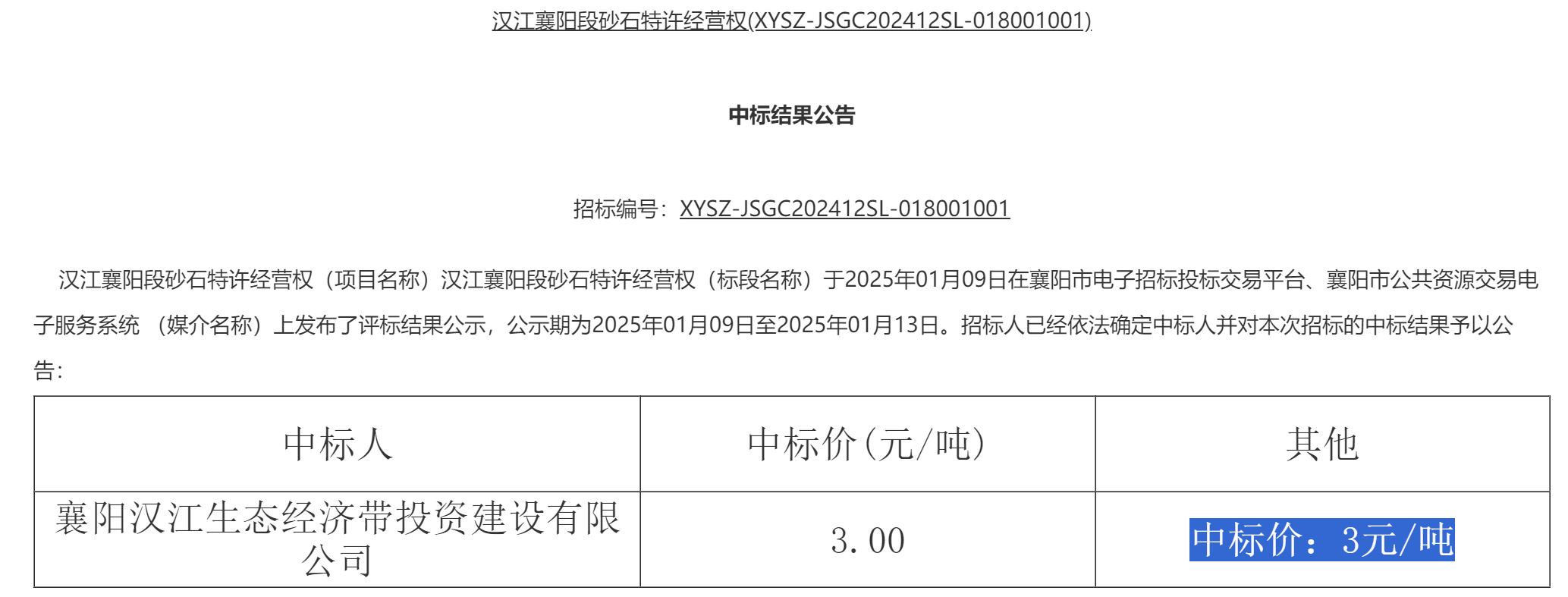 2025年1月20日發布中標公示襄陽漢江生態經濟帶投資建設有限公司以3元/噸中標。