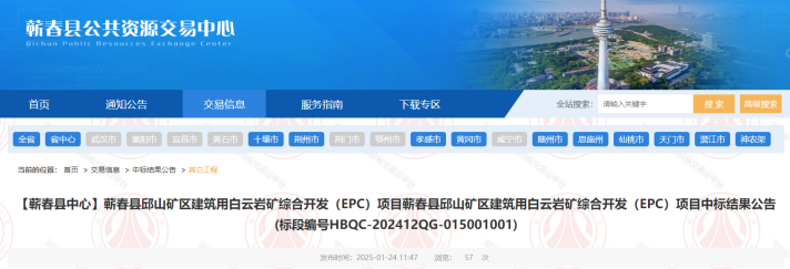 日前,湖北省蘄春縣公共資源交易中心發(fā)布蘄春縣邱山礦區(qū)建筑用白云巖礦綜合開(kāi)發(fā)(EPC)項(xiàng)目中標(biāo)結(jié)果公告。中圖設(shè)計(jì)有限公司、蘄春城一建設(shè)有限公司以超2.44億元中標(biāo)該項(xiàng)目,項(xiàng)目計(jì)劃工期730日歷天。