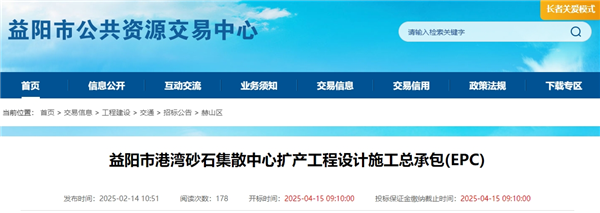 2月14日,湖南省益陽(yáng)市公共資源交易中心發(fā)布益陽(yáng)市港灣砂石集散中心擴(kuò)產(chǎn)工程(項(xiàng)目名稱)設(shè)計(jì)施工總承包(EPC)招標(biāo)公告,投標(biāo)截止時(shí)間為2025年4月15日。招標(biāo)人為益陽(yáng)市銀進(jìn)砂石經(jīng)營(yíng)有限公司,項(xiàng)目工程費(fèi)用概算金額為4692.47萬(wàn)元。