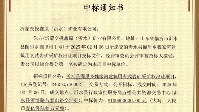 競(jìng)得人沂蒙交投鑫原(沂水)礦業(yè)有限公司成立于2024年12月31日,所屬行業(yè)為黑色金屬礦采選業(yè),經(jīng)營(yíng)范圍包含非煤礦山礦產(chǎn)資源開采、建筑材料銷售、建筑裝飾材料銷售、非金屬礦及制品銷售、非金屬礦物制品制造等,是山東沂蒙交通投資發(fā)展集團(tuán)有限公司旗下控股公司,屬國(guó)有企業(yè)。