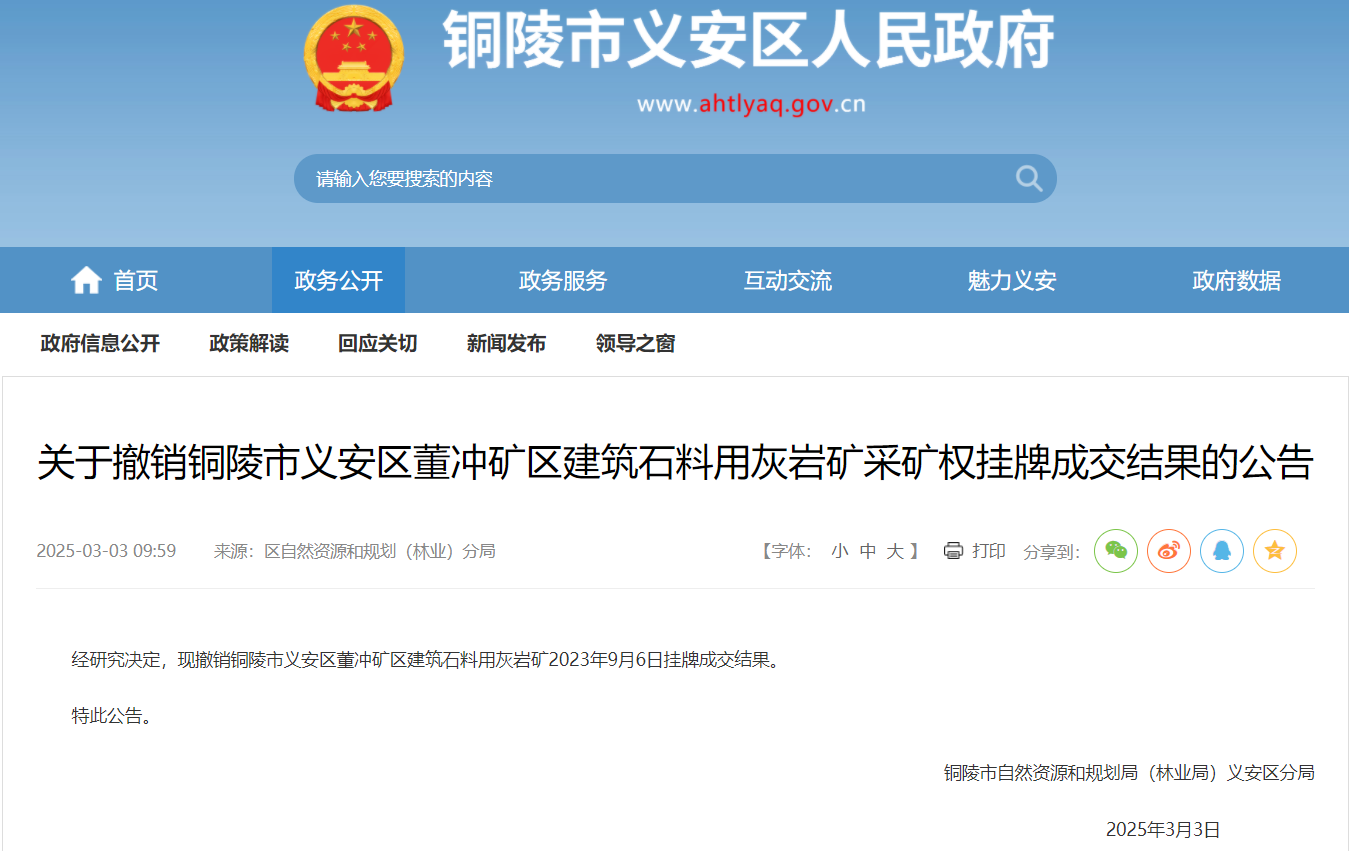 近日,安徽銅陵市自然資源和規劃局(林業局)義安區分局發布公告,經研究決定,撤銷銅陵市義安區董沖礦區建筑石料用灰巖礦2023年9月6日掛牌成交結果。 該礦權于2023年9月6日成交,競得人為銅陵縣董沖礦業有限責任公司,項目掛牌起始價18430.54萬元,成交價185305400元。年產300萬噸,擬出讓19.4年。