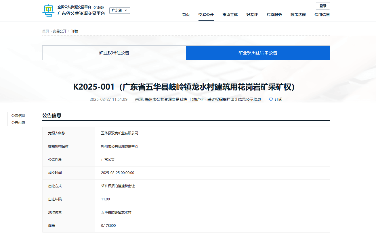 近日,梅州市公共資源交易平臺成功出讓廣東省五華縣岐嶺鎮龍水村建筑用花崗巖礦采礦權。該礦權資源儲量為建筑用花崗巖307.25萬m³,建設用砂8.9萬m³;生產規模為41萬m³/年,出讓年限為11年,五華縣雙宸礦業有限公司最終以底價870.32萬元競得此礦。
