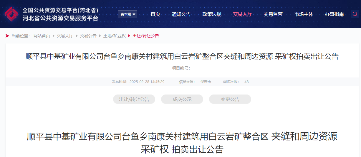 近日,河北省公共資源交易服務平臺發布順平縣中基礦業有限公司臺魚鄉南康關村建筑用白云巖礦整合區夾縫和周邊資源采礦權掛牌出讓公告。該礦開采礦種為建筑用白云巖,資源量5483.2萬立方米,出讓年限16.71年,起始價18387.65萬元。