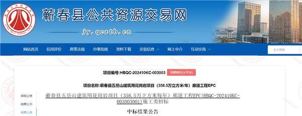 近日,湖北省黃岡市蘄春縣公共資源交易網(wǎng)發(fā)布蘄春縣五岳山950萬(wàn)噸/年建筑用花崗巖項(xiàng)目廊道工程EPC中標(biāo)公告。中交第二航務(wù)工程局有限公司、中交二航局第五工程有限公司、四川萬(wàn)尼騰建設(shè)工程有限公司、湖南省勘測(cè)設(shè)計(jì)院有限公司聯(lián)合體以超3.77億元中標(biāo)該項(xiàng)目。項(xiàng)目計(jì)劃工期325日歷天,主線廊道設(shè)計(jì)輸送能力為2000萬(wàn)噸/年。