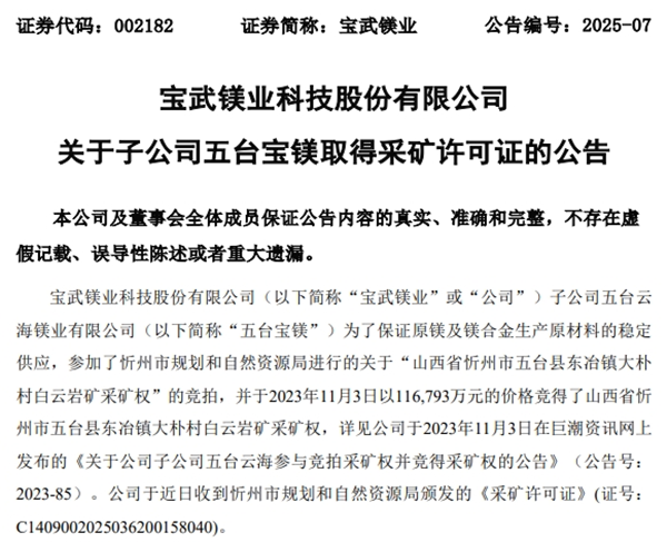 3月5日,寶武鎂業(yè)公告稱,其子公司五臺云海鎂業(yè)有限公司(簡稱“五臺寶鎂”)于近日收到了山西省忻州市五臺縣東冶鎮(zhèn)大樸村白云巖礦采礦許可證,有效期限為2025年3月4日至2055年3月4日。