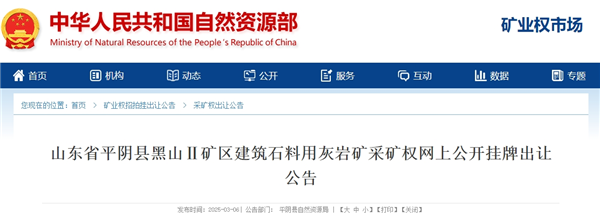 山東省濟南市平陰縣黑山Ⅱ礦區建筑石料用灰巖礦采礦權網上公開掛牌出讓。該礦可采儲量約合4428.21萬噸,生產規模400萬噸/年,擬出讓年限11.4年,起始價2.1億元。掛牌時間2025年4月7日至2025年4月22日。