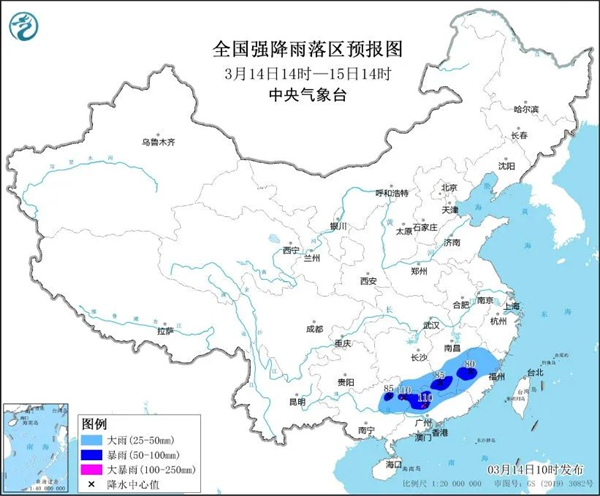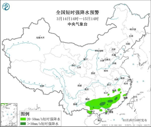 預計3月14日14時至15日14時,廣西東北部、廣東北部、湖南南部、江西中南部、福建西部等地部分地區有大到暴雨,其中廣西東北部、廣東西北部等地局地有大暴雨(100毫米至110毫米)。上述部分地區伴有短時強降水(最大小時降雨量20毫米至50毫米,局地可超過60毫米),局地有雷暴大風或冰雹等強對流天氣。