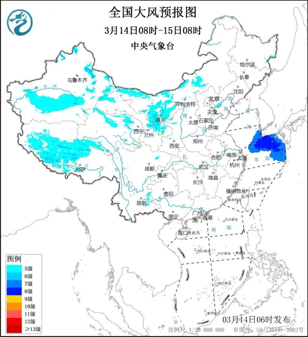預計3月14日08時至15日08時,新疆東部和南疆盆地、西藏中北部、青海北部、甘肅北部和東部、內蒙古中西部、寧夏等地部分地區有5級至6級風、陣風7級至8級;黃海東南部海域、東海北部海域將有7級至8級、陣風9級的大風。