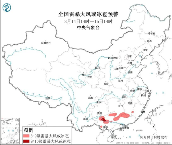 預計3月14日14時至15日14時,湖南南部、江西南部、廣西中北部、廣東北部等地的部分地區將有8級以上雷暴大風或冰雹天氣,其中廣西北部等地的部分地區將有10級以上雷暴大風;此外,湖南南部、江西南部、福建西部、廣西中北部、廣東北部等地的部分地區將有小時雨量大于20毫米的短時強降水天氣,其中江西南部、廣西北部、廣東北部等地的部分地區小時雨量大于50毫米,最大可達60毫米以上。