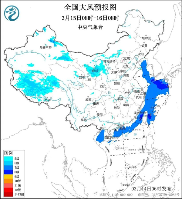 預計3月15日08時至16日08時,新疆東部、西藏中北部、青海西南部、甘肅北部和東部、內蒙古中部、寧夏、陜西北部等地部分地區有5級至6級風、陣風7級至8級;黃海大部海域、東海大部海域、臺灣海峽、臺灣以東洋面、南海北部海域、北部灣將有7級至8級、陣風9級的大風。