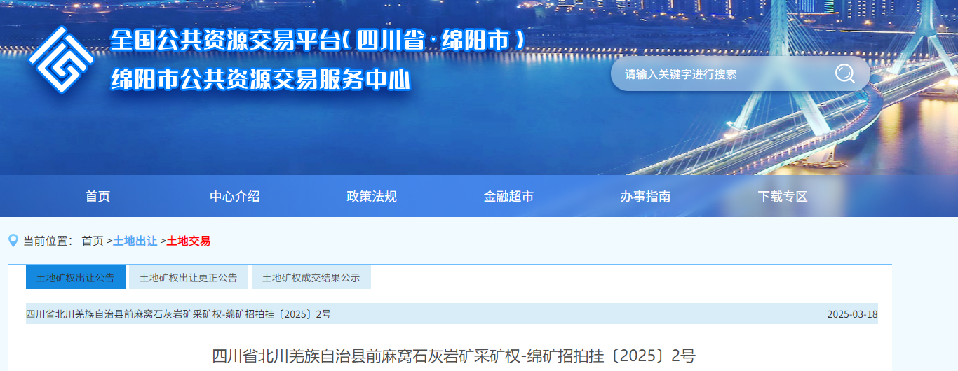 近日,四川省綿陽市公共資源交易服務中心發布北川羌族自治縣前麻窩石灰巖礦采礦權拍賣公告,開采境界內有石灰巖資源量3683.94萬噸,建筑石料用灰巖資源量2253.10萬噸,建筑用白云巖資源量5070.26萬噸,合計資源量11007.3萬噸。出讓年限21年,年產不低于500萬噸,29732萬元起拍,拍賣單價2.7元/噸。