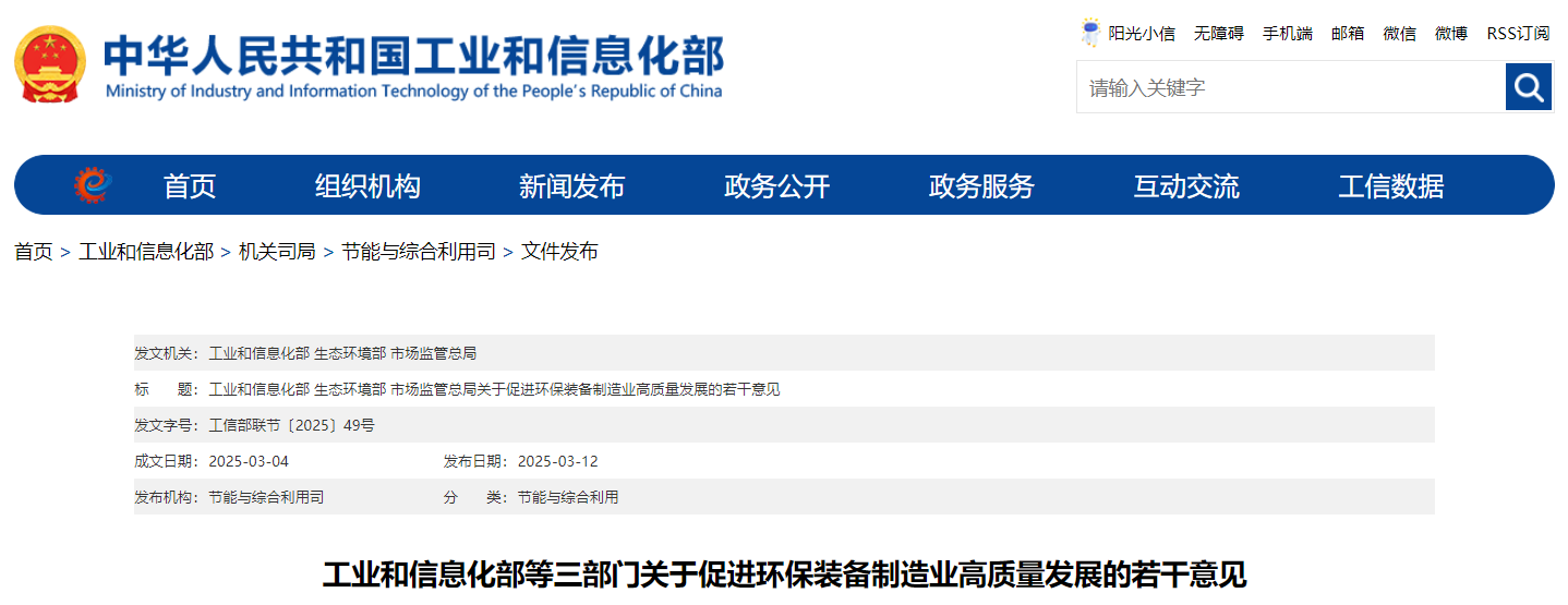 近日,工業(yè)和信息化部、生態(tài)環(huán)境部、市場監(jiān)管總局近日聯(lián)合印發(fā)《促進環(huán)保裝備制造業(yè)高質(zhì)量發(fā)展的若干意見》(工信部聯(lián)節(jié)〔2025〕49號,以下簡稱《意見》),著力推動環(huán)保裝備制造業(yè)持續(xù)健..