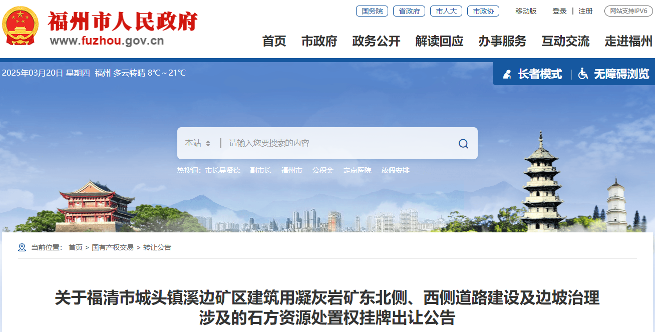 近日,福建省福州市福清市發(fā)布城頭鎮(zhèn)溪邊礦區(qū)建筑用凝灰?guī)r礦東北側(cè)、西側(cè)道路建設(shè)及邊坡治理涉及的石方資源處置權(quán)掛牌出讓公告。