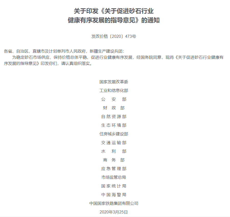 2025年3月25日是國家發改委等十五部門和單位聯合印發的《關于促進砂石行業健康有序發展的指導意見》(以下簡稱《指導意見》)出臺的5周年。這是國家出臺的關于砂石行業的專門的指導文件,充分體現了中央對砂石行業發展的關注和重視,尤其是強調砂石行業要健康有序、高質量發展。