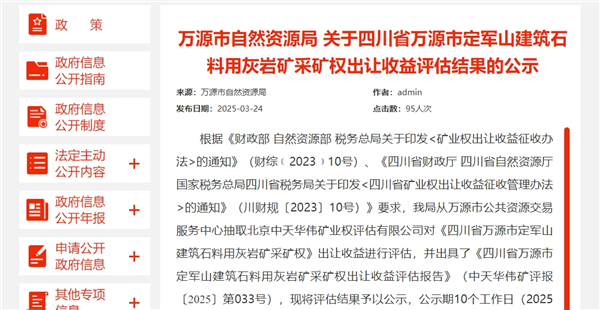 3月24日,四川省萬源市人民政府發布定軍山建筑石料用灰巖礦采礦權出讓收益評估結果公示。該礦資源儲量近2.4億噸,生產規模500萬噸/年,服務年限47.16年(基建期2年),評估價值超3.6億元。