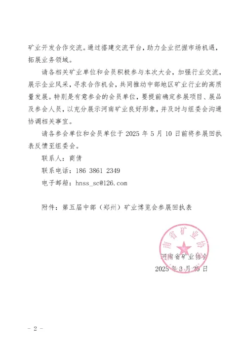 請各相關礦業單位和會員積極參與本次大會,加強行業交流,展示企業風采,尋求合作機會,共同推動中部地區礦業行業的高質量發展。特別是有意參會的會員單位,要提前確定參展項目、展品及參會人員,以充分展示河南礦業良好形象,并及時與組委會溝通協調相關事宜。