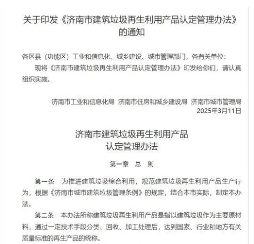 為推進(jìn)建筑垃圾綜合利用,規(guī)范建筑垃圾再生利用產(chǎn)品生產(chǎn)行為,近日濟(jì)南市工業(yè)和信息化局、濟(jì)南市住房和城鄉(xiāng)建設(shè)局和濟(jì)南市城市管理局聯(lián)合發(fā)布通知,印發(fā)《濟(jì)南市建筑垃圾再生利用產(chǎn)品認(rèn)定管理辦法》(以下簡(jiǎn)稱《管理辦法》)。