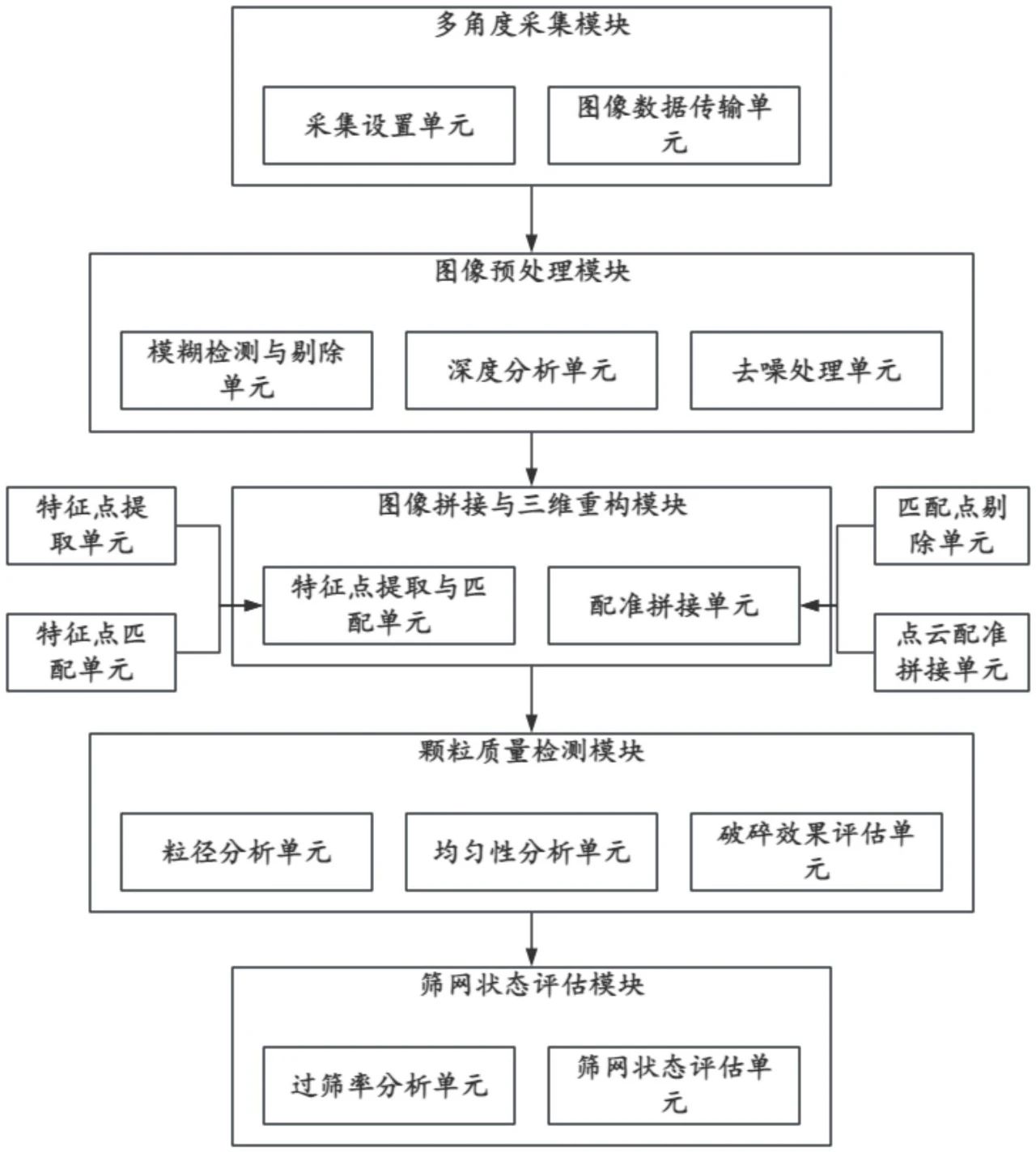 專利摘要顯示,本發(fā)明公開了一種砂石粉碎顆粒度大小的質(zhì)量檢測(cè)系統(tǒng),涉及碎石檢測(cè)技術(shù)領(lǐng)域,該系統(tǒng)通過(guò)多角度圖像采集模塊和三維重構(gòu)模塊,能夠高效、精確地獲取砂石顆粒的多角度圖像數(shù)據(jù),并通過(guò)圖像拼接與三維重構(gòu)技術(shù)生成高精度的三維顆粒模型。通過(guò)分析三維模型的三角網(wǎng)格頂點(diǎn)向量,計(jì)算顆粒的等效粒徑和均勻性指標(biāo)實(shí)現(xiàn)了對(duì)砂石顆粒質(zhì)量的自動(dòng)化評(píng)估。能夠準(zhǔn)確地評(píng)估砂石顆粒的質(zhì)量與均勻性,為生產(chǎn)過(guò)程中的質(zhì)量控制提供精確數(shù)據(jù)支持,并根據(jù)砂石顆粒的尺寸與均勻性,及時(shí)生成破碎工藝調(diào)整預(yù)警,并為生產(chǎn)線提供精確的質(zhì)量檢測(cè)數(shù)據(jù)。這一技術(shù)顯著提高了檢測(cè)精度,替代了傳統(tǒng)人工篩分方式,降低了人為誤差,提高了生產(chǎn)效率和自動(dòng)化程度。