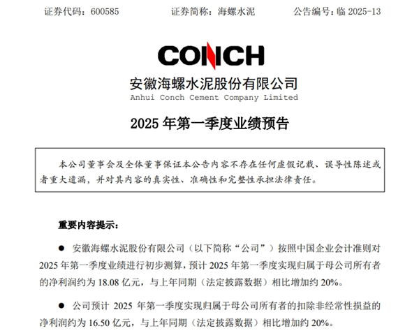 同比增加20%!海螺水泥預(yù)計一季度凈利潤18.08億元