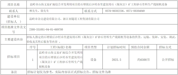 4月10日,浙江省臺(tái)州市溫嶺市人民政府發(fā)布溫嶺市山海文旅礦地綜合開發(fā)利用項(xiàng)目的石塘鎮(zhèn)后沙村岙里建筑用石(凝灰?guī)r)礦工程砂石骨料生產(chǎn)線輔機(jī)設(shè)備招標(biāo)計(jì)劃,計(jì)劃2025年5月招標(biāo)。預(yù)估合同金額約6500萬。