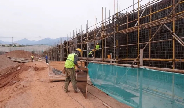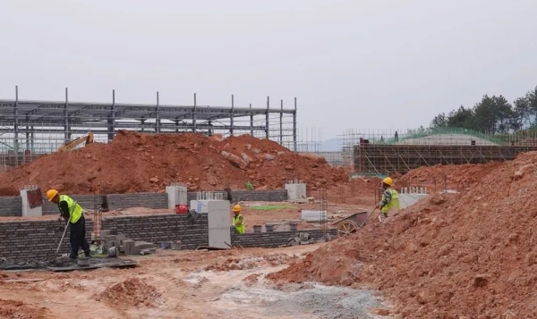 在固廢資源循環(huán)利用及基礎設施項目建設現(xiàn)場,機械轟鳴,工人們則在各自的施工點位上忙著砌筑基礎墻、綁扎鋼筋等施工作業(yè)。