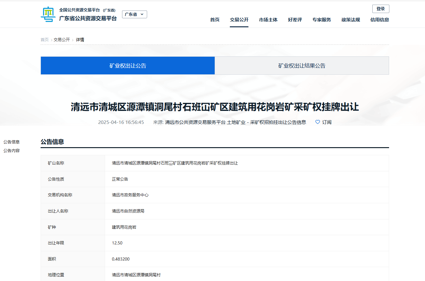 近日,廣東省清遠市公共資源交易平臺以網上掛牌形式出讓廣東清遠市清城區源潭鎮洞尾村石班冚礦區建筑用花崗巖礦采礦權。