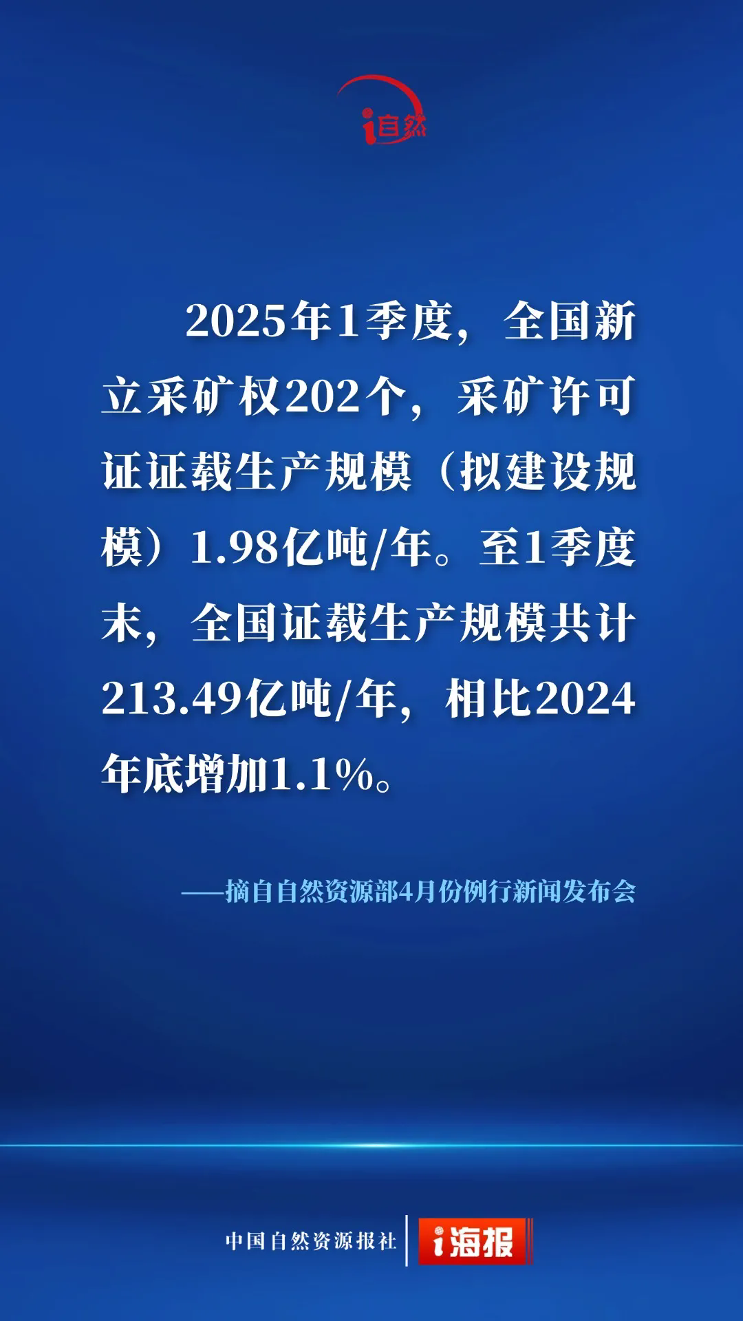 會上,自然資源部宣傳教育中心主任夏俊指出,2025年1季度,全國新立采礦權202個,采礦許可證證載生產規模(擬建設規模)1.98億噸/年。至1季度末,全國證載生產規模共計213.49億噸/年,相比2024年底增加1.1%