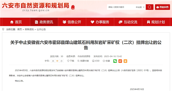 4月16日,安徽省六安市自然資源和規劃局發布消息稱,因受相關政策影響,決定中止安徽省六安市霍邱縣煤山建筑石料用灰巖礦采礦權(二次)掛牌出讓。據悉,該礦資源儲量共7747.98萬噸,出讓年限14年8個月,產能近600萬噸/年(未披露具體年產能,該數據為估算),起始價8億元,資源成本超10.32元/噸。