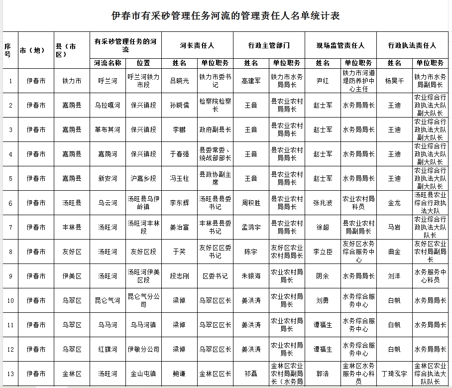 伊春市有采砂管理任務河流的管理責任人名單統計表