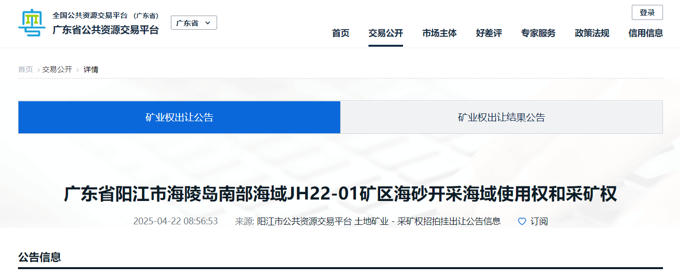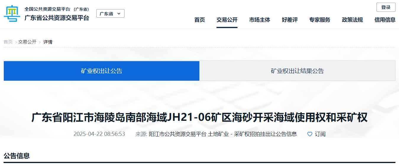 近日,廣東省公共資源交易平臺(tái)顯示,廣東陽(yáng)江出讓海陵島南部海域JH21-06、JH22-01兩礦區(qū)海砂開(kāi)采海域使用權(quán)和采礦權(quán)。兩個(gè)海砂項(xiàng)目,起始價(jià)合計(jì)15.7億,資源儲(chǔ)量共計(jì)4816.46萬(wàn)方,年開(kāi)采量共計(jì)1415萬(wàn)方/年。