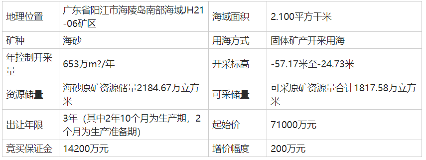 近日,廣東省公共資源交易平臺(tái)顯示,廣東陽(yáng)江出讓海陵島南部海域JH21-06、JH22-01兩礦區(qū)海砂開(kāi)采海域使用權(quán)和采礦權(quán)。兩個(gè)海砂項(xiàng)目,起始價(jià)合計(jì)15.7億,資源儲(chǔ)量共計(jì)4816.46萬(wàn)方,年開(kāi)采量共計(jì)1415..