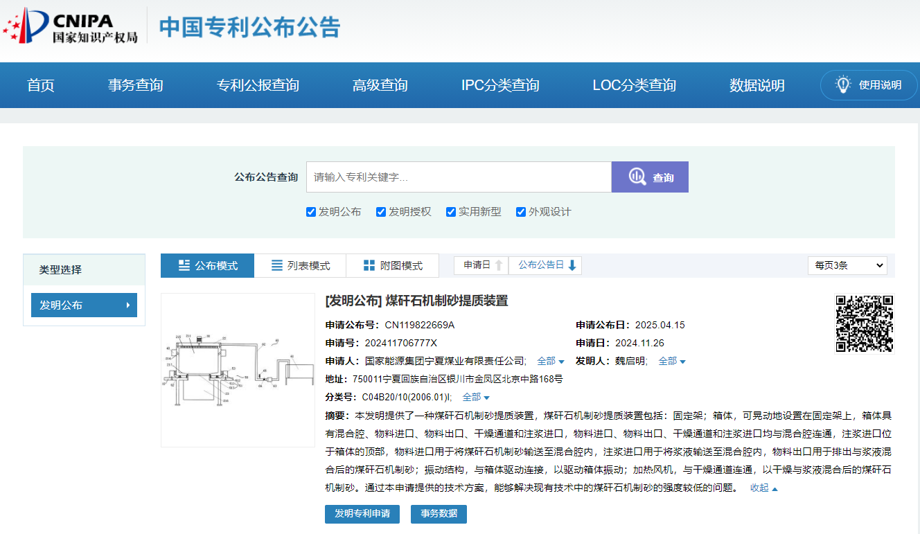 近日,國(guó)家能源集團(tuán)寧夏煤業(yè)有限責(zé)任公司申請(qǐng)一項(xiàng)名為“煤矸石機(jī)制砂提質(zhì)裝置”的專利,公開號(hào)CN119822669A,申請(qǐng)日期為2024年11月。本次申請(qǐng)?zhí)峁┑募夹g(shù)方案,能夠解決現(xiàn)有技術(shù)中的煤矸石機(jī)制砂的強(qiáng)度較低的問題。