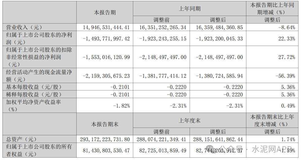 2025年1-3月,公司外銷水泥熟料3,770萬噸,銷售商品混凝土1,389萬方,外銷骨料2,046萬噸;受水泥銷售價格同比上升,水泥、商品混凝土成本同比下降影響,經(jīng)營效益同比上升,公司實現(xiàn)營業(yè)收入149.47億元,較上年同期下降8.64%;歸屬于上市公司股東的凈利潤-149,377萬元,較上年同期上升22.33%。
