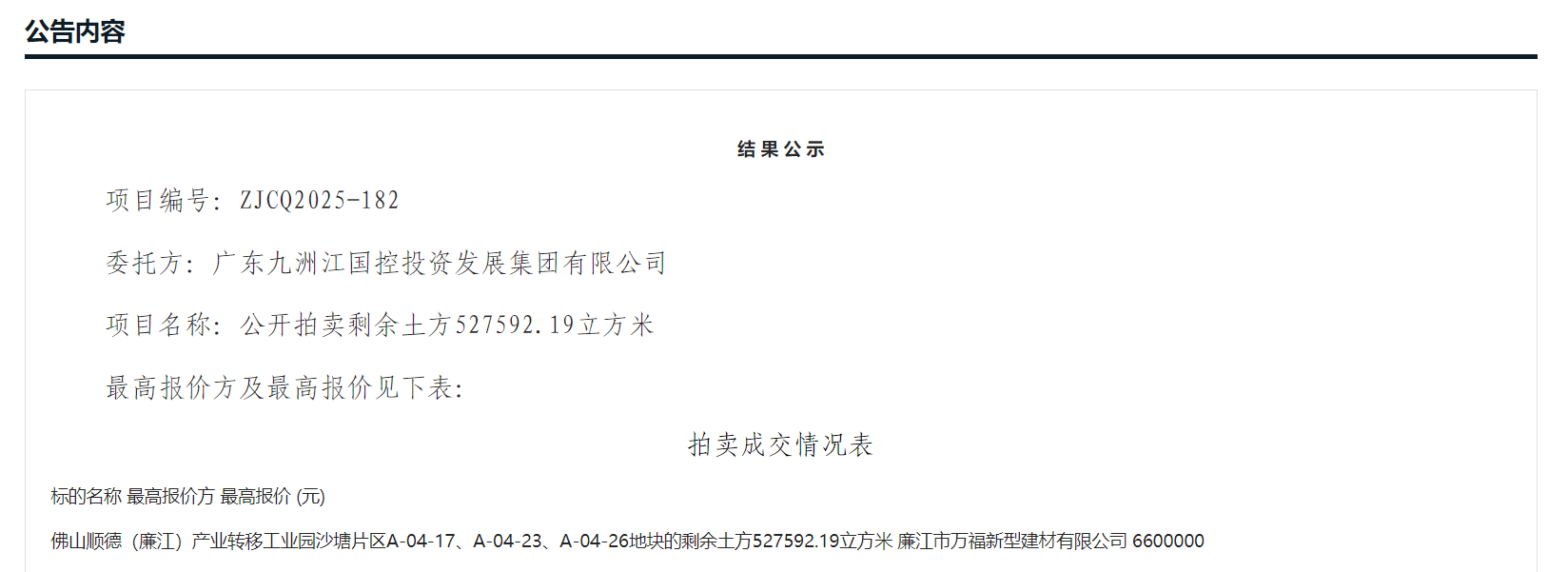 近日,根據廣東省公共資源交易平臺信息,廣東佛山順德(廉江)產業轉移工業園沙塘片區A-04-17、A-04-23、A-04-26地塊527592.19立方米的剩余土方成功出讓,競得人為廉江市萬福新型建材有限公司,成交金額660萬元。根據出讓公告,該項目起拍價格163.55萬元,成交價溢價了3倍有余!