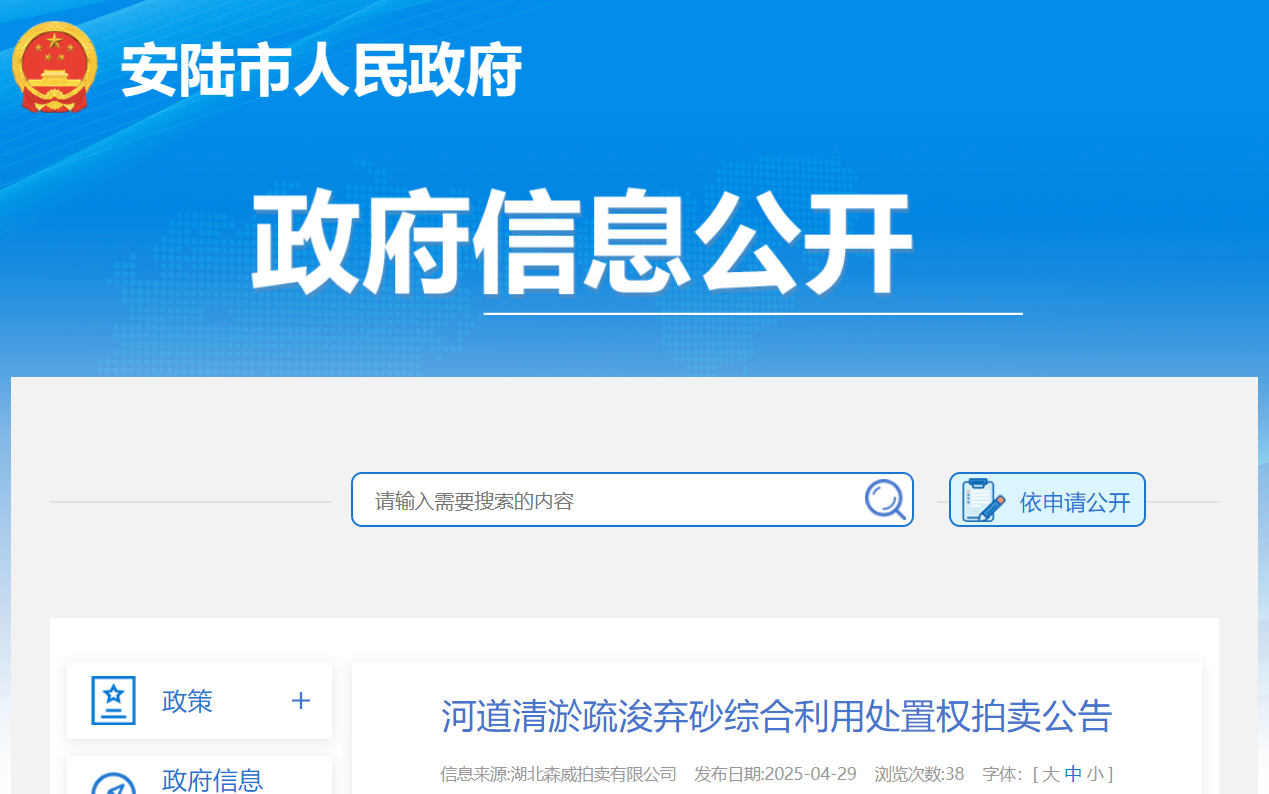 近日,湖北省孝感市安陸市發布公告,2025年5月9日對安陸市清水河等14條河道清淤疏浚棄砂綜合利用處置權進行公開拍賣。該項目可利用棄砂資源量約為22153.97萬噸,河砂型號為中粗砂,處置權經營期限(含建設期)10年。