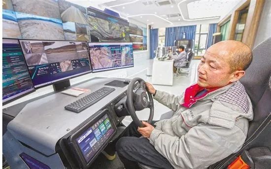 在智能集成中控室,一到兩個(gè)人就能監(jiān)管這些車輛的安全有序運(yùn)行。技術(shù)員盧善康盯著眼前的電腦屏幕,實(shí)時(shí)監(jiān)測(cè)各輛礦車的行駛畫(huà)面。如遇車輛臨時(shí)更改線路,他便通過(guò)遠(yuǎn)程操控座機(jī),遙控車子停到安全地點(diǎn)。